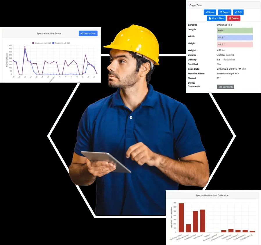 Spectre Hub is a cloud storage and analytics solution that gives Cargo Spectre clients a management-level overview of all freight scanned by their organization’s dimensioners. Users can monitor aggregated freight data in any warehouse from any internet connection in the world. This groundbreaking data management solution makes all your freight DIMs accessible, organized, and searchable from anywhere using any device.